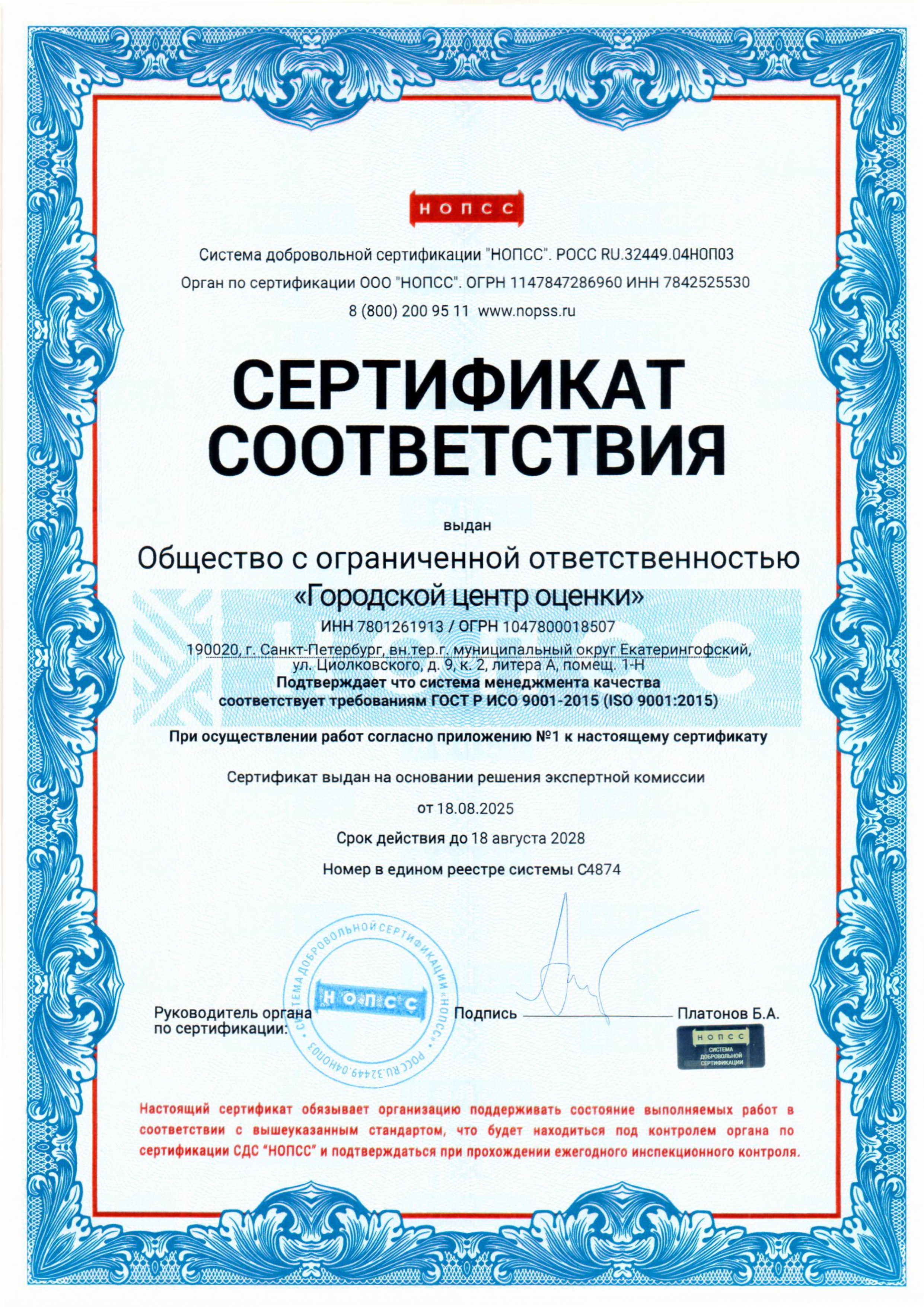 Система менеджмента качества ООО «Городской центр оценки» соответствует требованиям ГОСТ ISO 9001-2015.